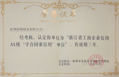 日前,杭州盾牌鏈條有限公司被杭州市余杭區市場監督管理局認定為2015年度“浙江省工商企業信用AA級‘守合同重信用’單位”。這是盾牌公司長期以來樹立“守合同,重信用”的理念,在經營中誠信守約、合法經營獲得的殊榮。