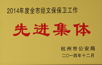 日前,公司被杭州市公安局授予“2014年度全市經文保保衛工作先進集體”榮譽稱號,公司保衛科被授予“余杭區經濟文化保衛戰線先進集體”榮譽稱號。