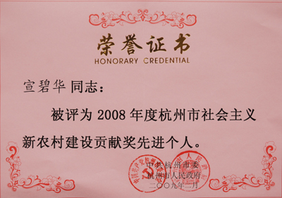 日前,東華鏈條集團董事長宣碧華被中共杭州市委、杭州市人民政府授予 “2008年度杭州市社會主義新農村建設貢獻獎先進個人”榮譽稱號。