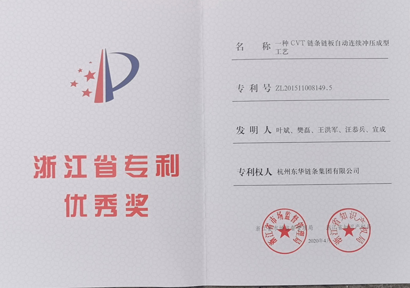 東華鏈條集團“一種CVT鏈條鏈板自動連續(xù)沖壓成型工藝”發(fā)明專利榮獲浙江省專利優(yōu)秀獎。本工藝投入使用后,在不增加人工、設備情況下,提升產品質量,同時可省去傳統去毛刺工序,節(jié)約加工時間,提高效率,縮短產品加工流程,提高產品質量的穩(wěn)定性。