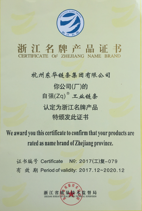 日前,東華集團的“自強(Zq)®工業鏈條被浙江省質量技術監督局認定為浙江省名牌產品,有效期自2017年12月至2020年12月。