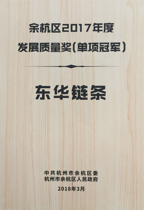 東華鏈條被授予“余杭區2017年度發展質量獎(單項冠軍)”稱號
