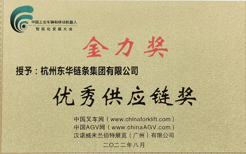 8月24日,由中國叉車網(wǎng)、中國AGV網(wǎng)、漢諾威米蘭佰特展覽(廣州)有限公司聯(lián)合主辦的“2022中國工業(yè)車輛和移動機器人智能化發(fā)展大會暨頒獎盛典”在廣州市中國進出口商品交易會展館舉行。東華被大會授予“金力獎-優(yōu)秀供應鏈獎”,是獲獎的唯一一家鏈條企業(yè)。