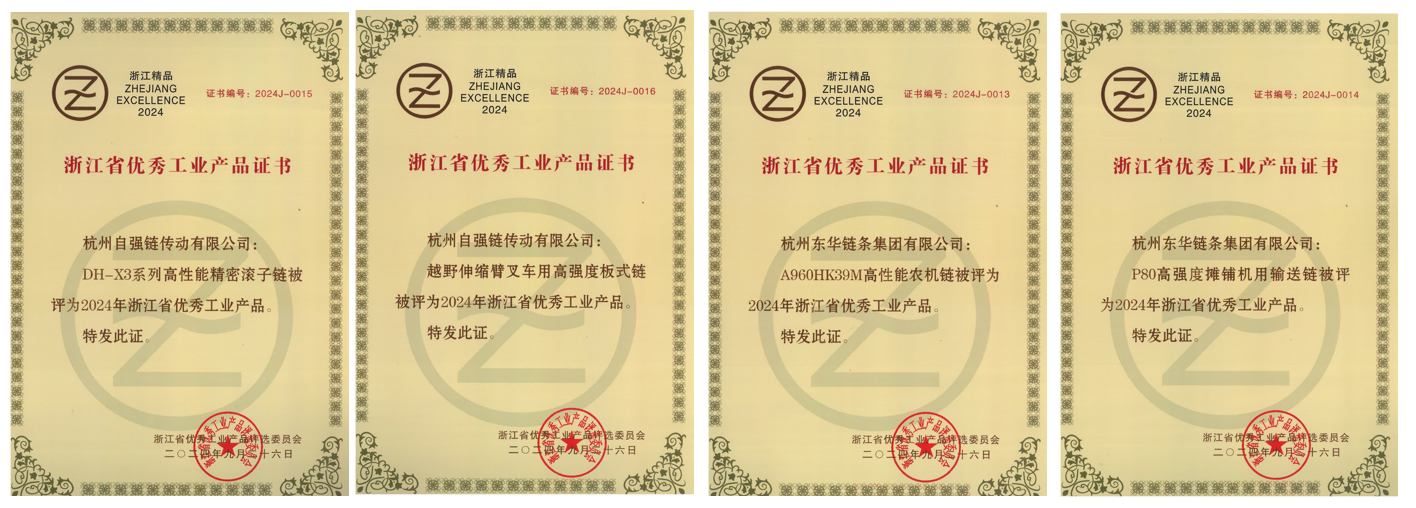 日前,浙江省優(yōu)秀工業(yè)產(chǎn)品評(píng)選委員會(huì)發(fā)布了“2024年浙江省優(yōu)秀工業(yè)產(chǎn)品”,東華四項(xiàng)高端產(chǎn)品榮獲“浙江省優(yōu)秀工業(yè)產(chǎn)品”稱號(hào)。分別是“DH-X3系列高性能精密滾子鏈”、“越野伸縮臂叉車用高強(qiáng)度板式鏈”、“A960HK39M高性能農(nóng)機(jī)鏈”、“P80高強(qiáng)度攤鋪機(jī)用輸送鏈”。