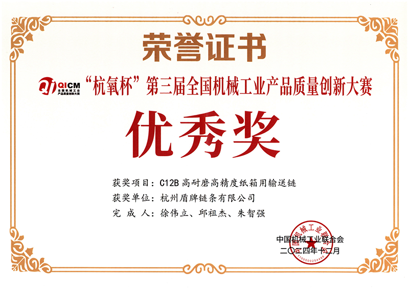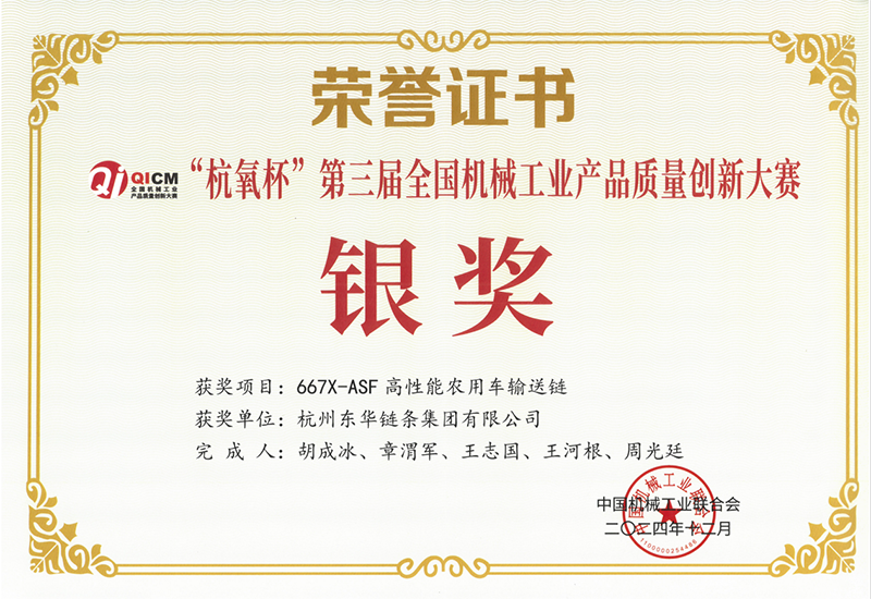 會上,頒發了“杭氧杯”第三屆全國機械工業產品質量創新獎。東華榮獲兩項銀獎和一項優秀獎。銀獎分別是由扶梯工程鏈事業部選送的“PT133F38重載型梯級鏈條”項目和農機鏈事業部選送的“667X-ASF高性能農用車輸送鏈”項目,由盾牌鏈條選送的“C12B高耐磨高精度紙箱用輸送鏈”榮獲優秀獎。項目負責人上臺領獎。