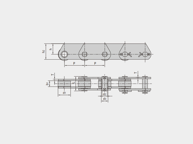 ● 米制輸送鏈是指鏈條節距為公制整數(節距范圍40mm~1000mm的多種節距)的滾子鏈或套筒鏈,滾子有多種結構形式,根據使用工況配置各種附件。